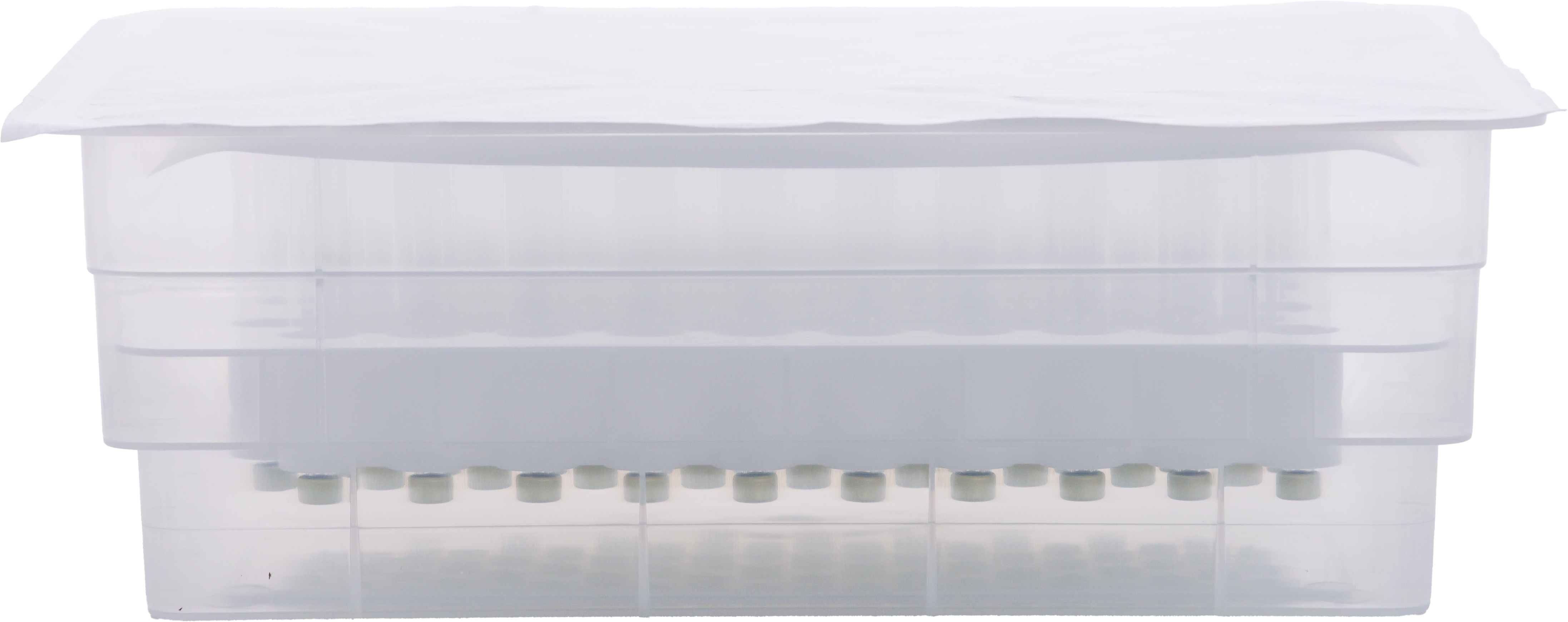 Cartridges are sold in a singular, sterile tub of 100. Cartridges are not individually wrapped. This packaging design is intended for pharmaceutical manufacturers and compatible with most automated fill finish lines. Cartridges can also be manually filled in an ISO 5 laminar flow hood using our semi-automatic fill finish machine.